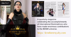 Exclusive interviews with Mistress Sidonia von Bork, Countess Dionysus, Domina Sreni, Mansplaining with Dickie Virgin. Advice column with Mistress Simone Worthington. Reviews: Dungeon by VC Studios, Book by Alicia Zadig, Event by Femdom Gala, Members’ Site by Club Stiletto. Mistress on Tour with Goddess Kara. Words of Wisdomme “Ageing (and Ageism) in Femdom by Lady Bellatrix. This is a Female led publication designed for the international Femdom community.